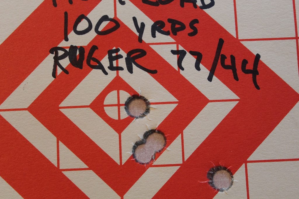 Here are some of the targets we generated during our year-long testing. We worked our way through numerous powder, primer, and projectile combinations in order to achieve the best accuracy and shot-to-shot velocity consistency, all the while pressure testing each and every combination to assure safe chamber pressures. Our primary test platforms were the Ruger 77/44 rifle with a 1:20 twist, and a Winchester lever action model 94AE with a 1:26 twist rate. Most testing for accuracy was done at 50 yards to minimize shooter error. Once the best load was determined we extended our shooting in 50 yard intervals, up to 200 yards, checking for bullet stability as the target’s distance increased.